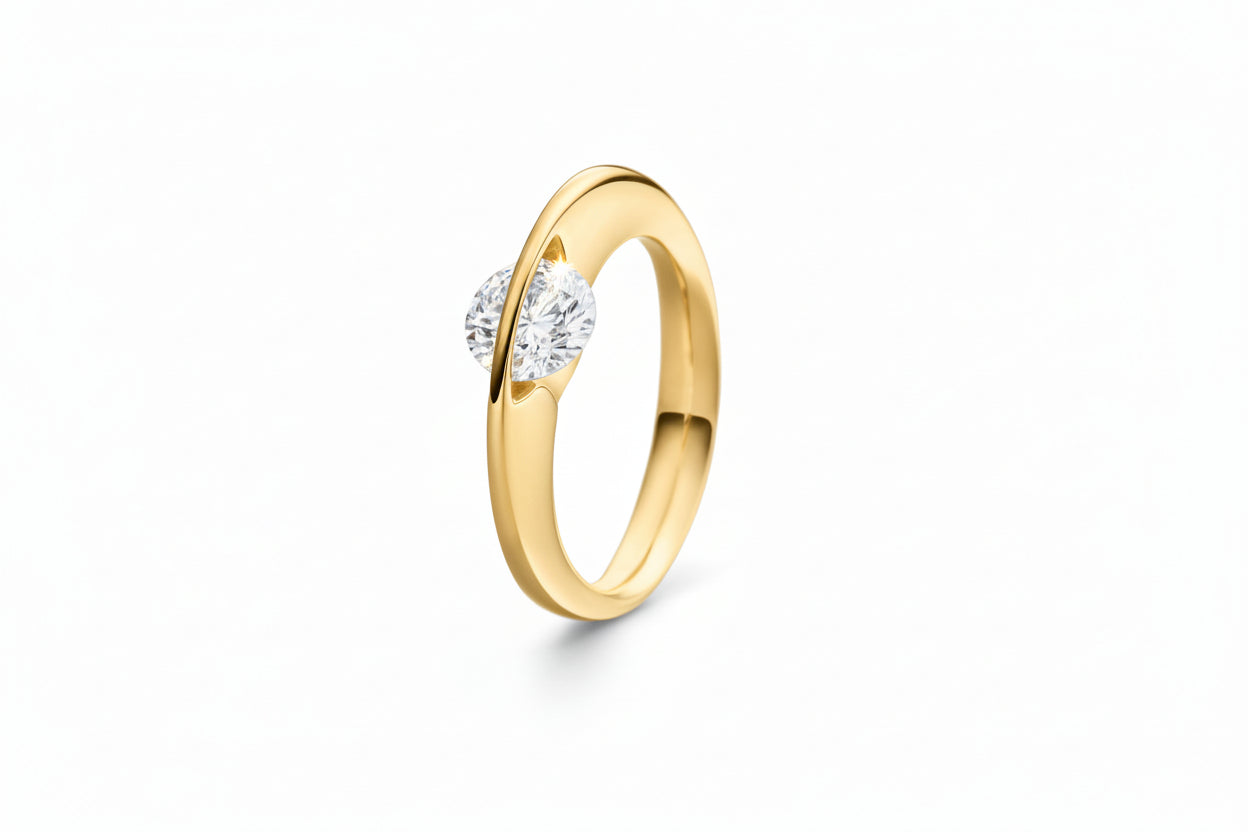 A collection with diamonds that sit completely loose within their setting and mirror the wearer's movements, creating mesmerizing reflections and plays of color. The diamond is held by a golden bridge, which is welded over the diamond after it is set and protects the diamond, so it cannot fall out of the ring.