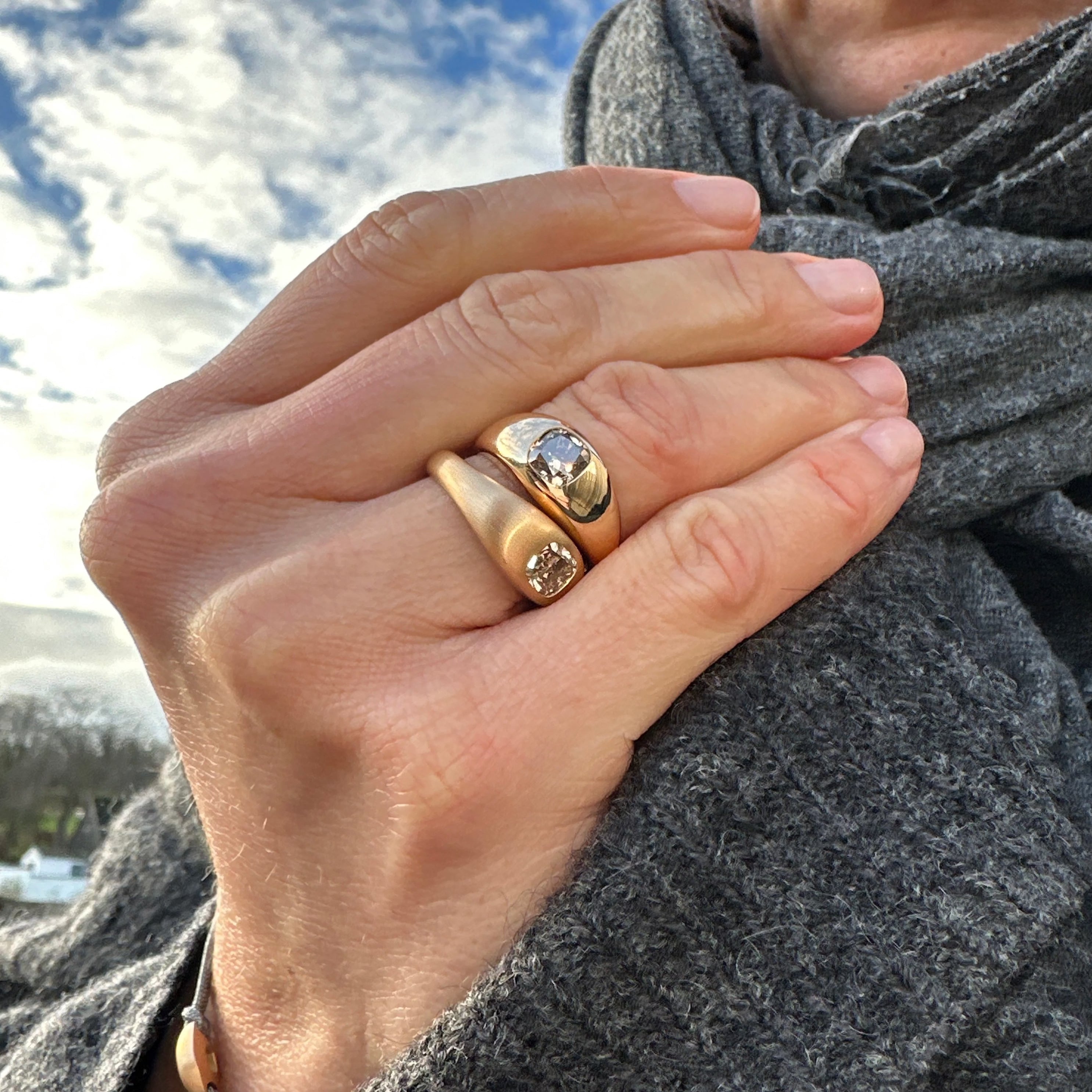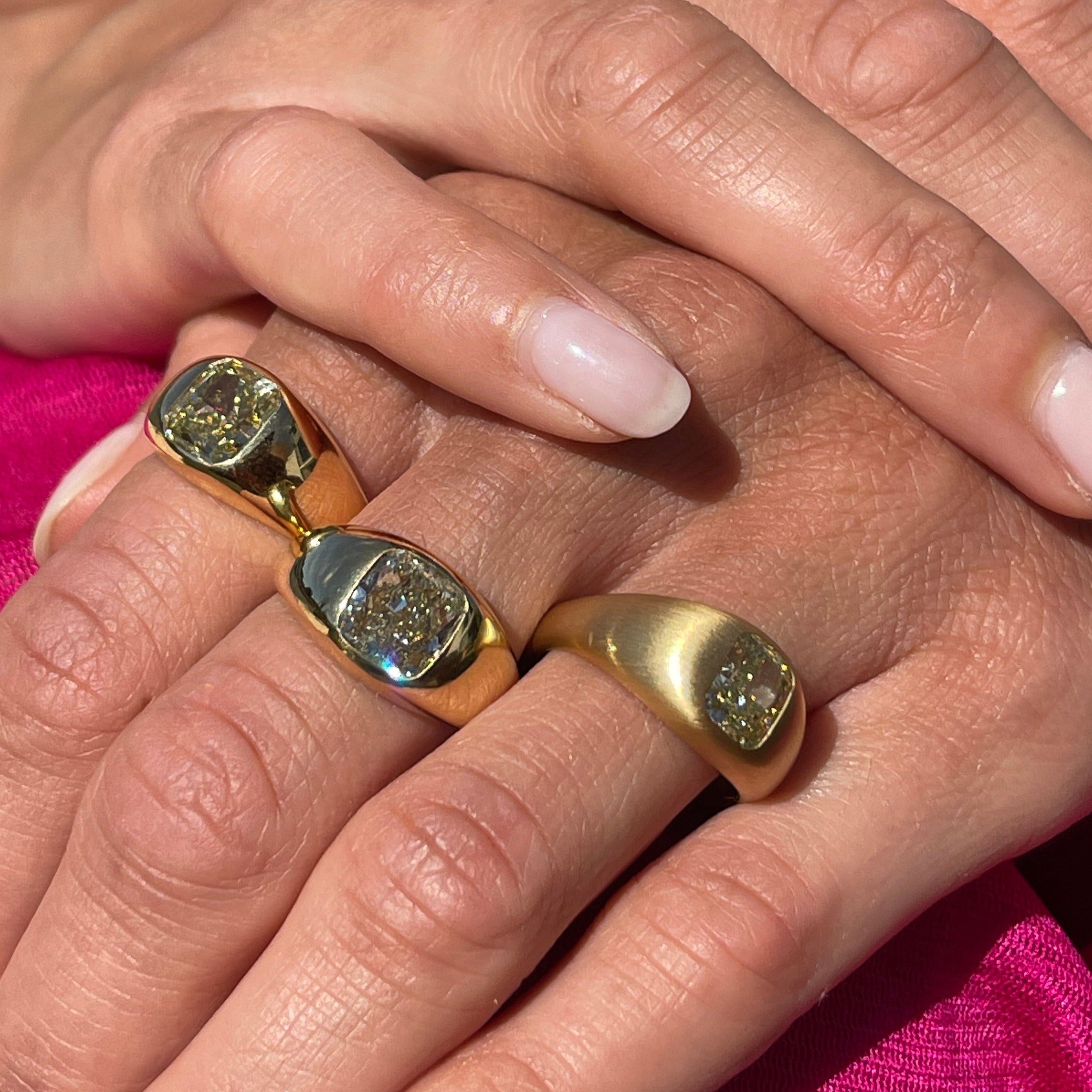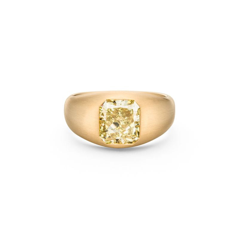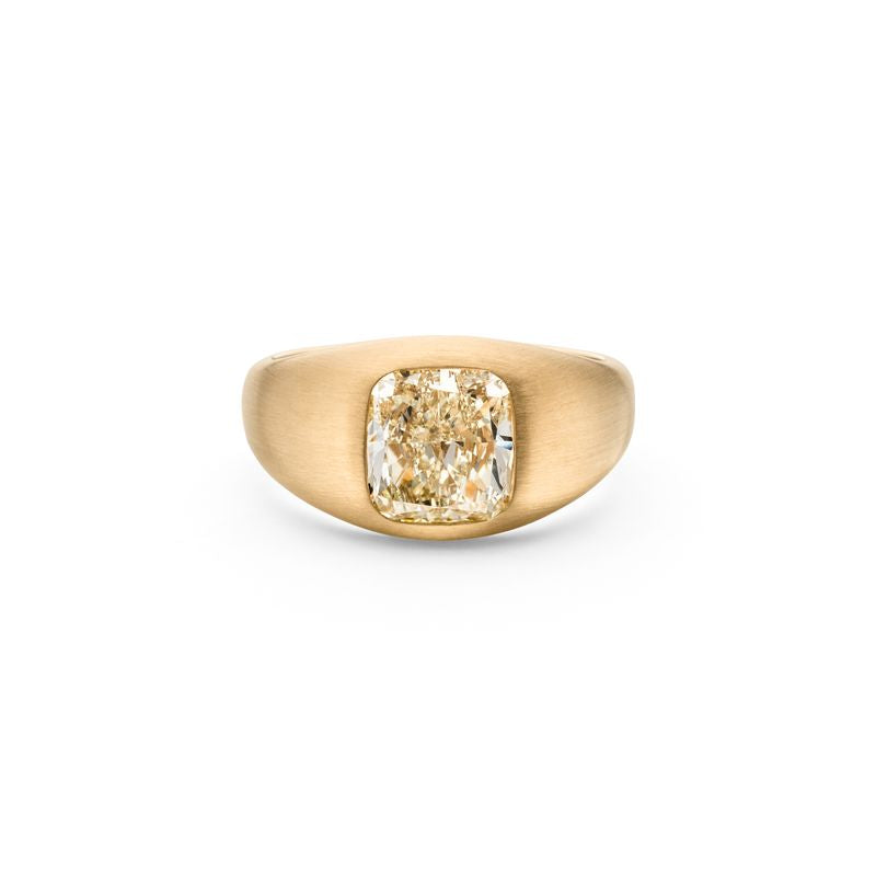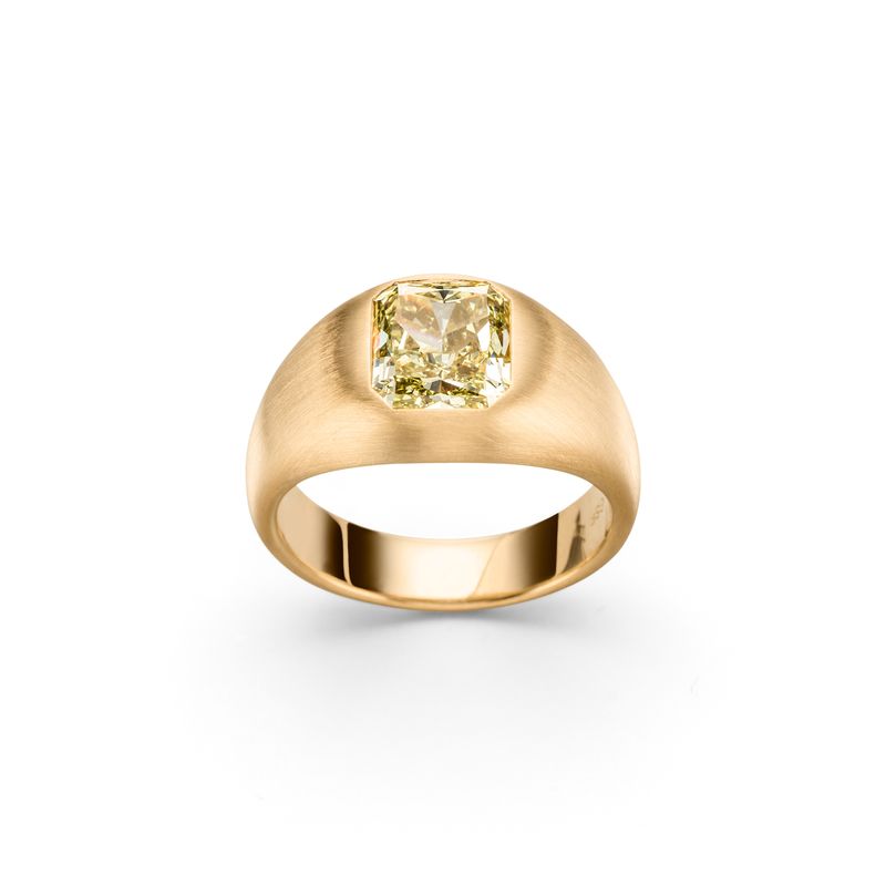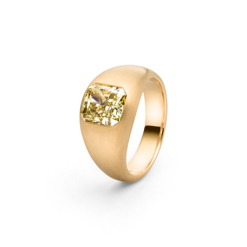 En massiv, kraftig ring, a la 1970 ernes signet-ringe. I fokus er der indfattet en cushion cut diamond i en fancy colour, som tåler at blive brugt hver dag. Pris fra 98.000,-kr Priseksempel: