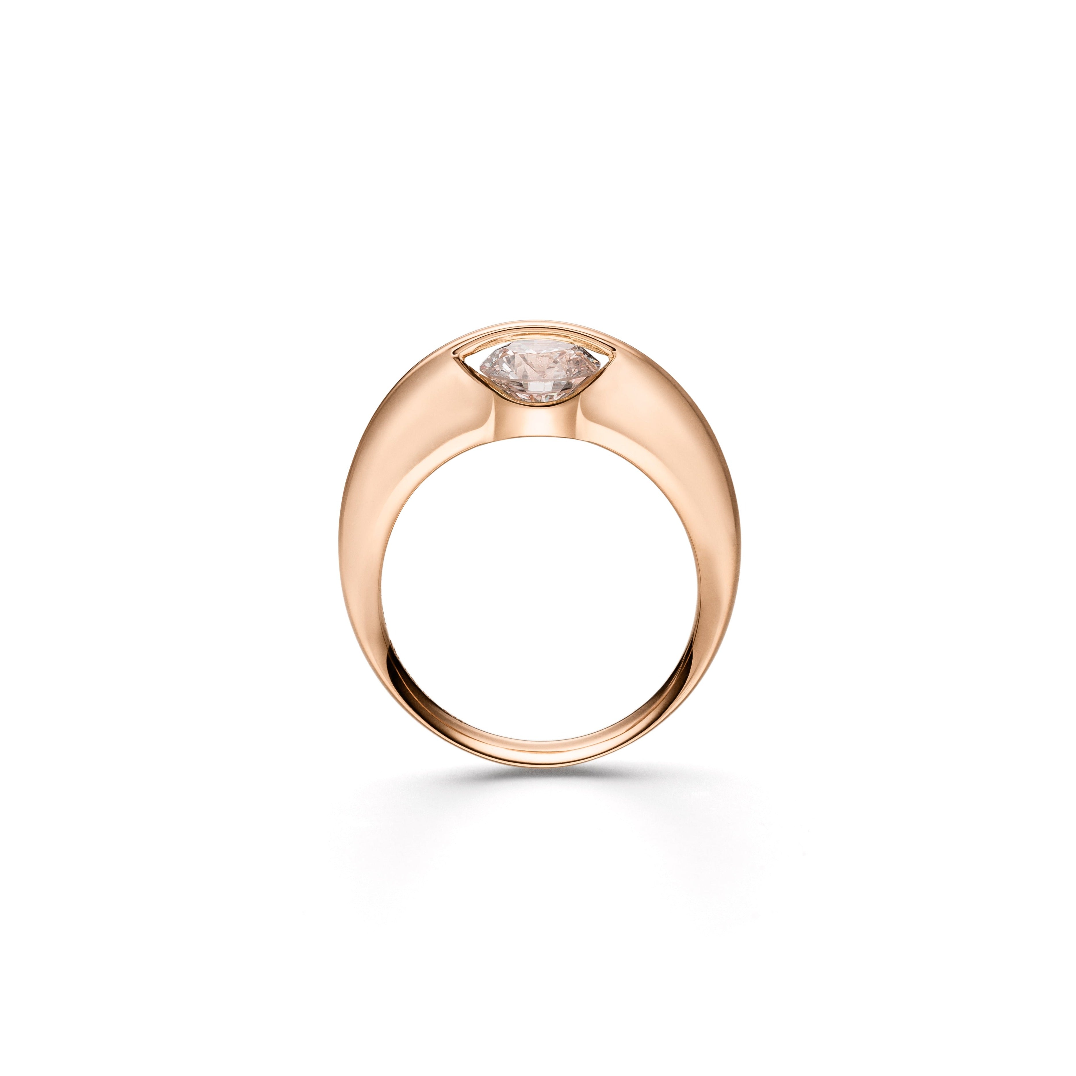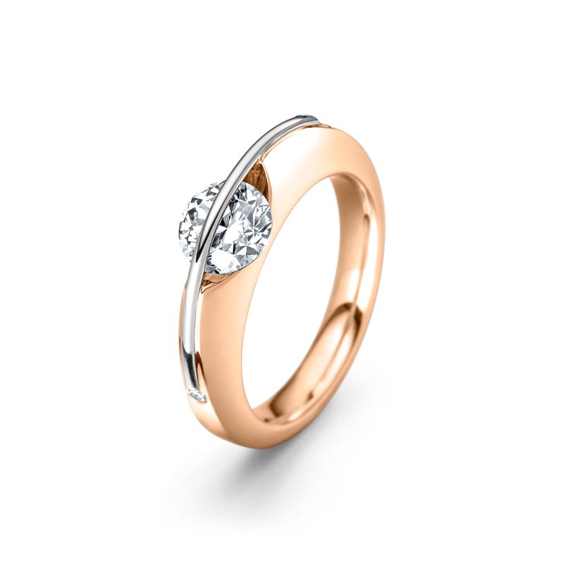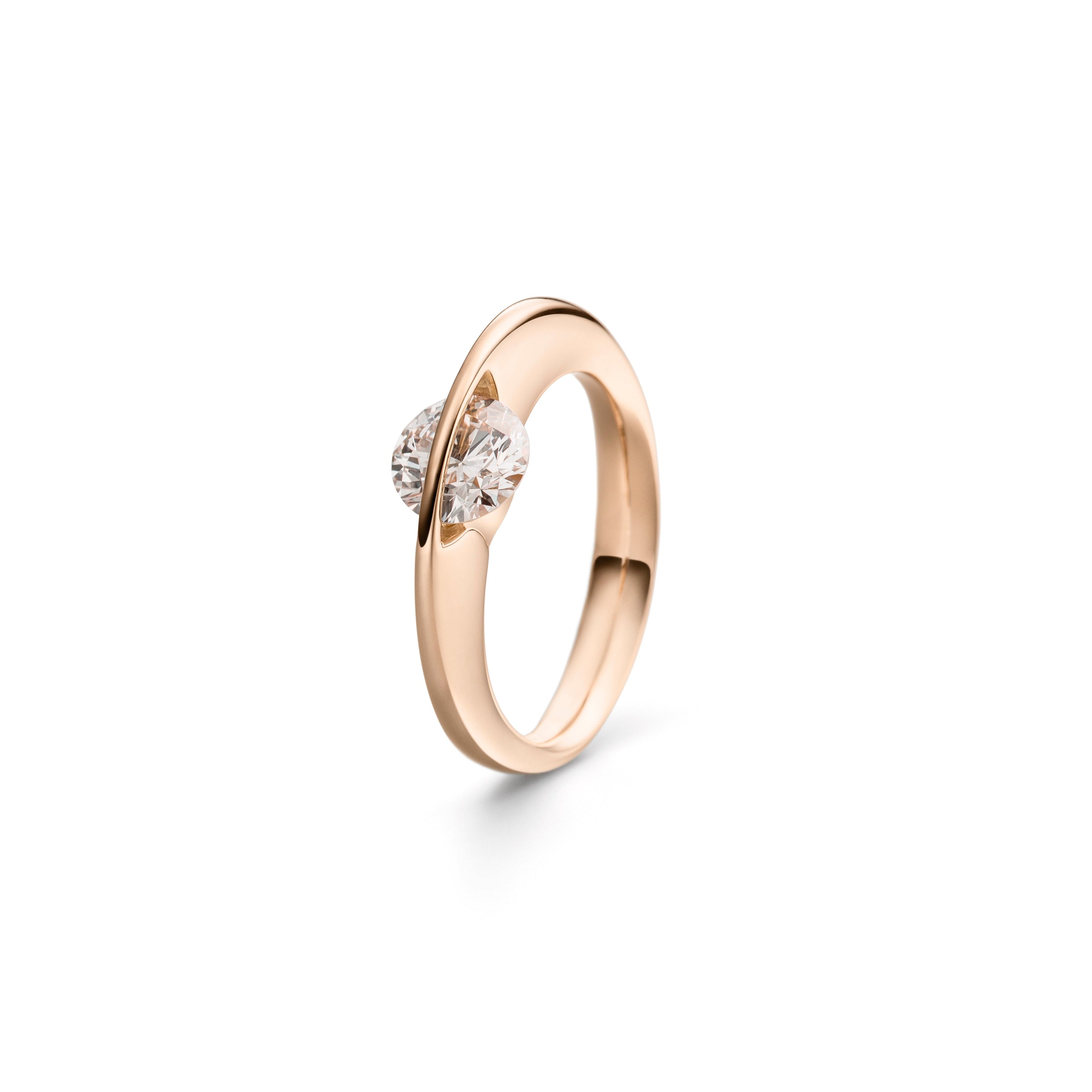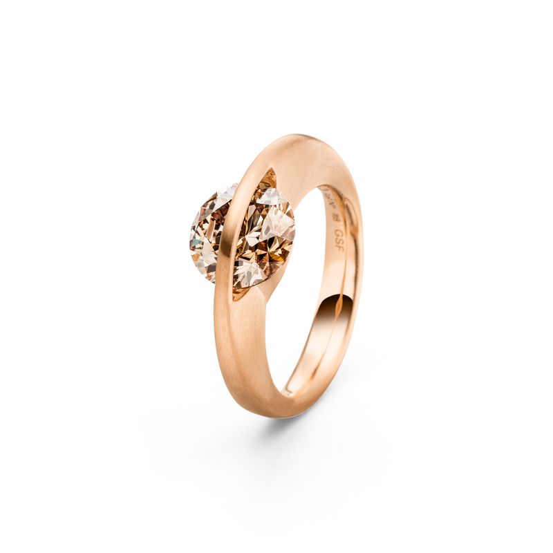 Ringen med verdens første frit svævende brillant. Ja, det er rigtigt, brillanten sidder helt løst og bevæger sig. Dette kan lade sig gøre, fordi vi lodder en bøjle over brillanten, efter den er lagt i en fordybning med spidsen. Brillanten kan nu frit dreje og ryste fra side til side uden at falde ud, da bøjlen beskytter den og spidsen hviler i en fordybning. Pris fra 39.000,-kr. Priseksempel: