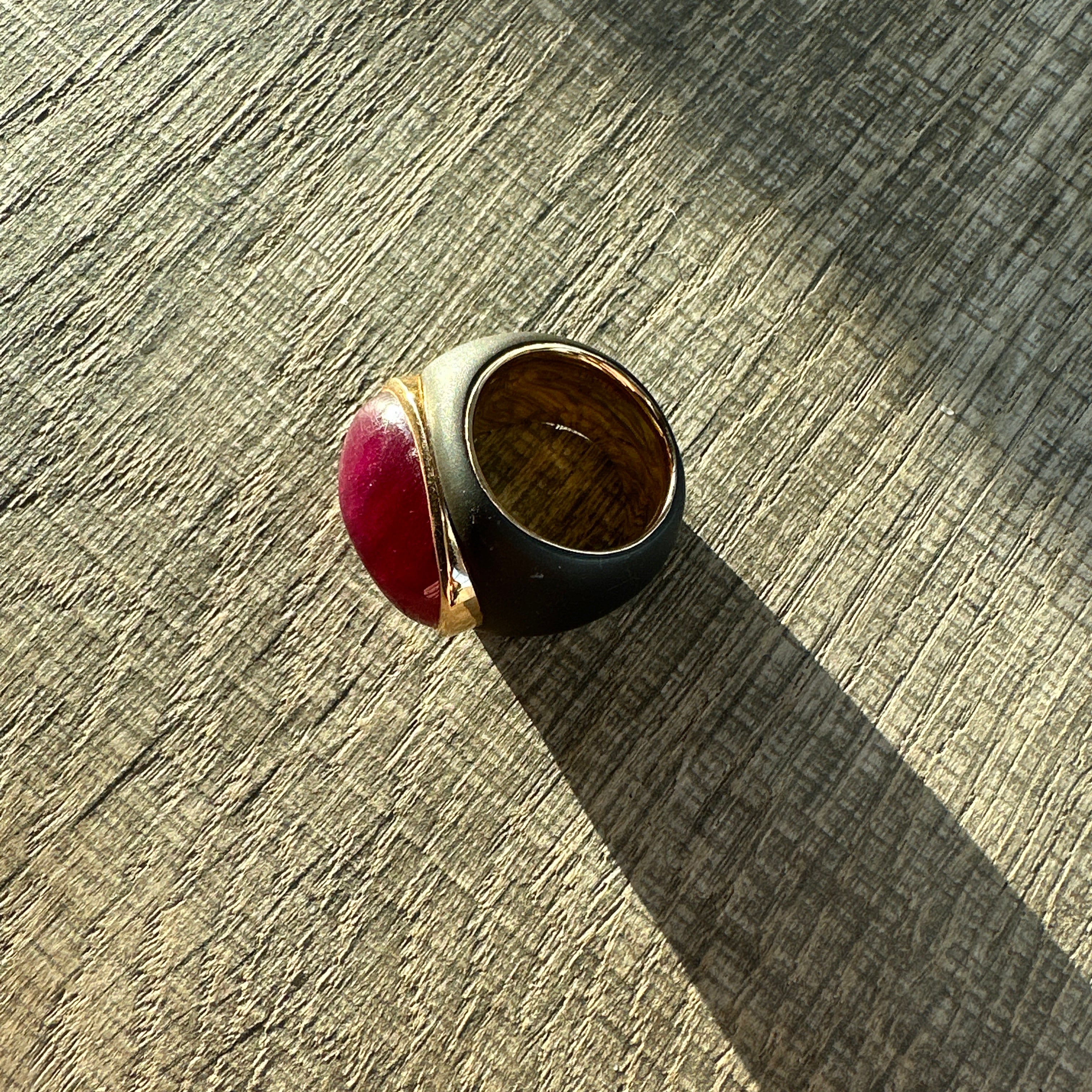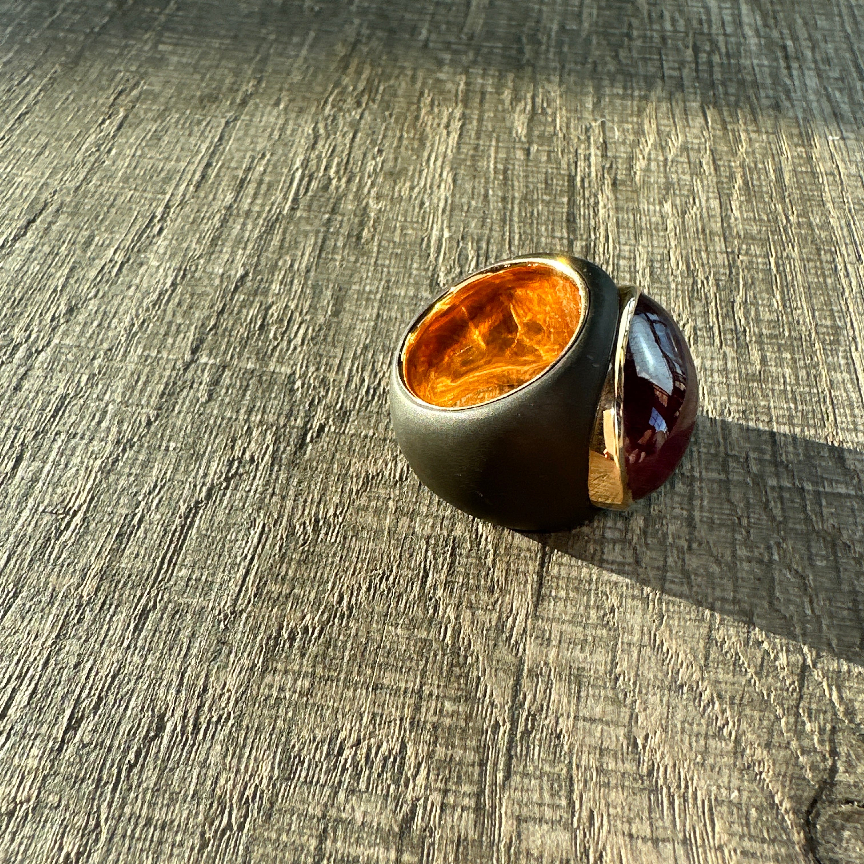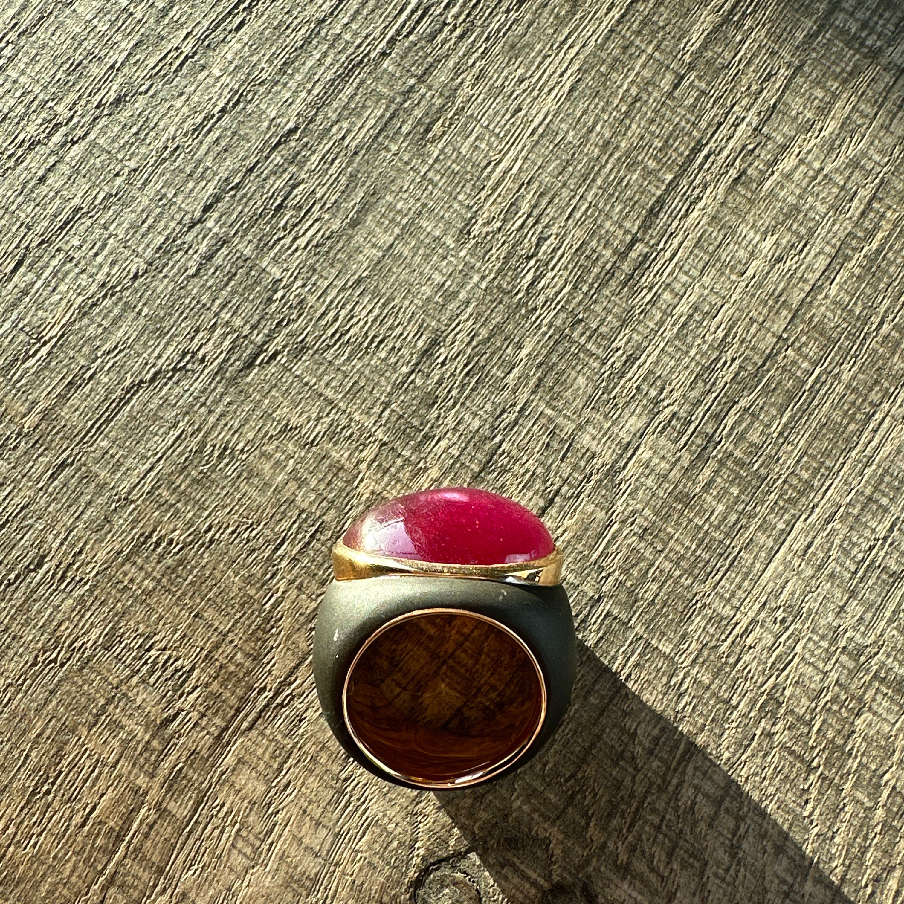 Huge ring made in 18 kt gold, black steel and a Ruby.