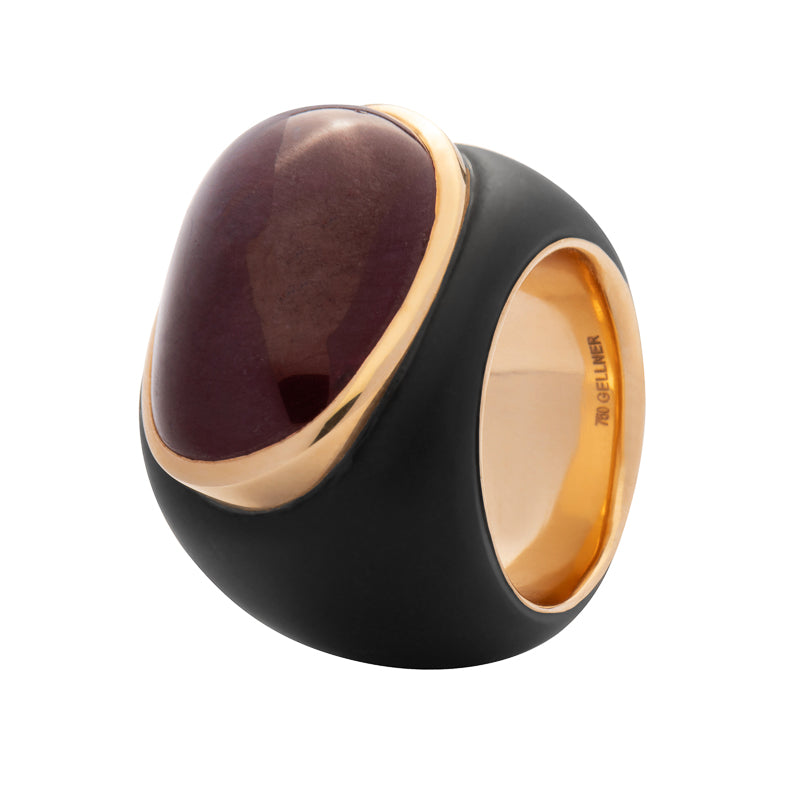 Ring black steel, 18 kt gold and Ruby